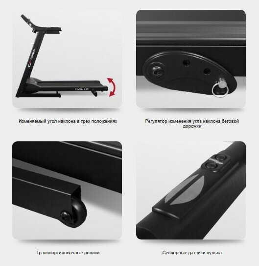 Качество Сборка Выбор программ, высоты дорожки, скорости Пульсометр, счетчик калорий |