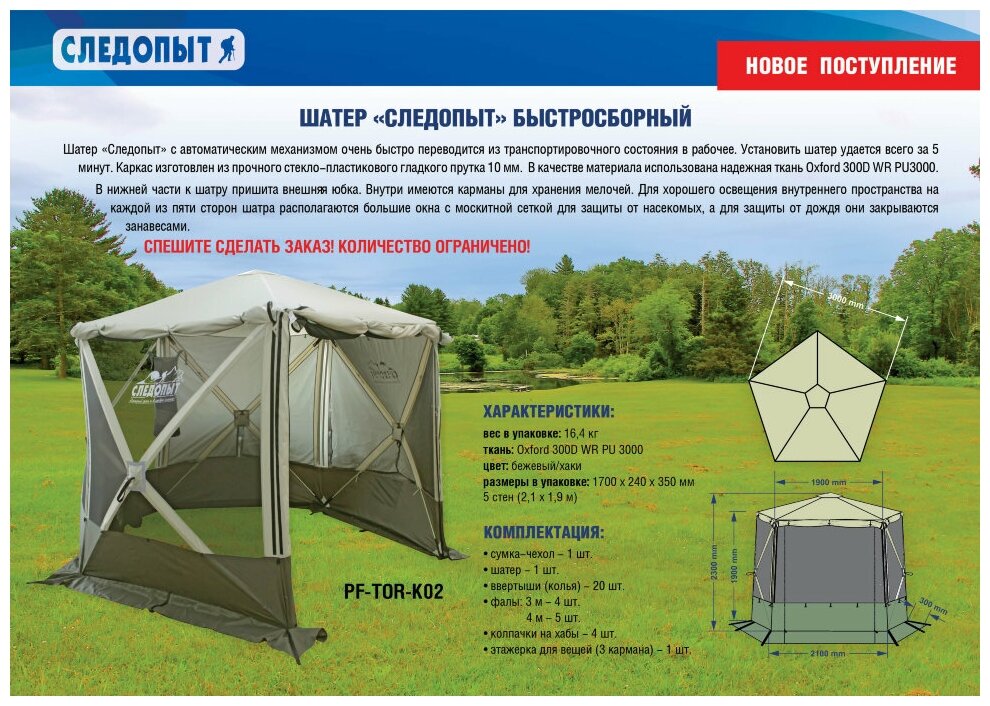 Быстросборный автоматический шатер Следопыт 5 стен (PF-TOR-K02) интересное: