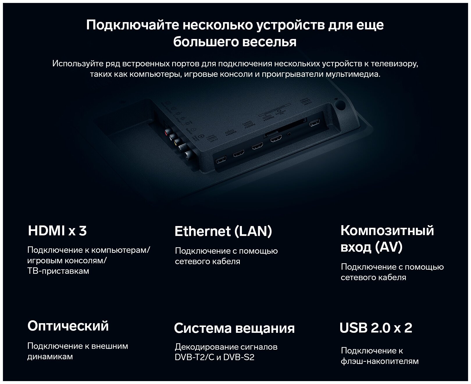 | Минусы: | Ножки расставлены довольно широко и телевизор встанет не на любую тумбу. Не очень удобно возвращаться из приложений к ты сигналу, но тут приходит на помощь голосовое управление, говоришь какой порт включить. |