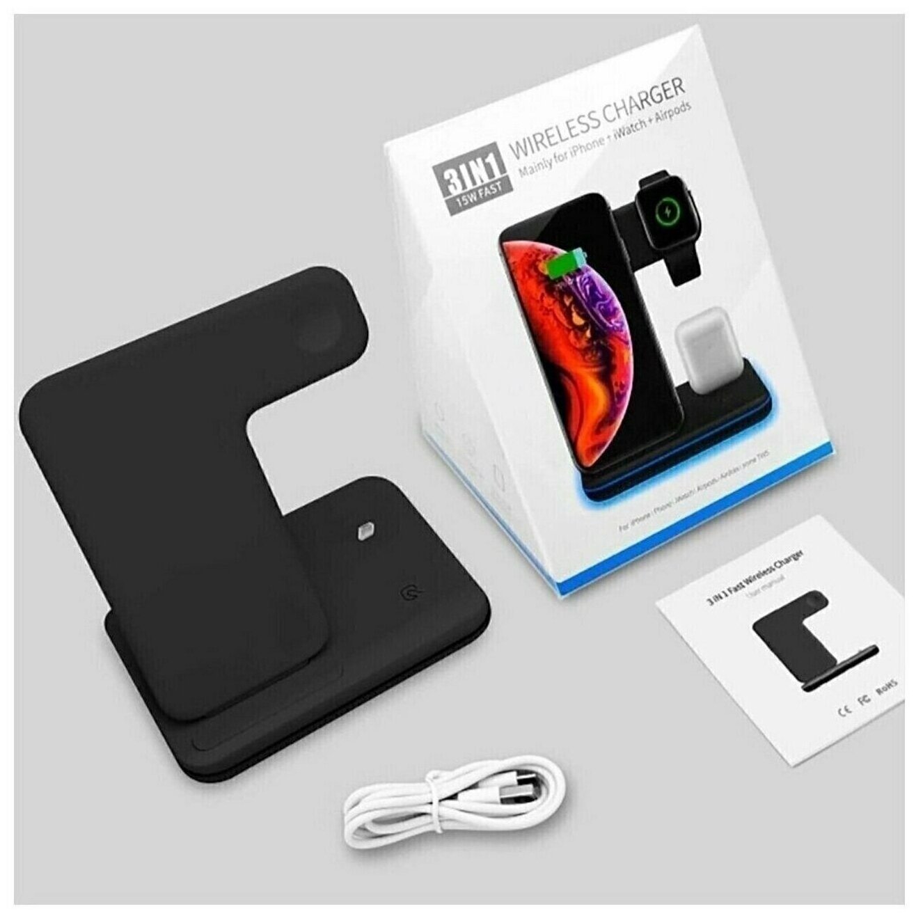 Беспроводная зарядная Док Станция 3 в 1 для портативной зарядки телефонов, умных смарт часов и наушников (черный)