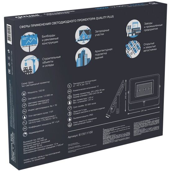 Прожектор светодиодный 100Вт 6500К черный IP65 210x32x283 12000Лм Qplus Gauss 613511100 (1/4)