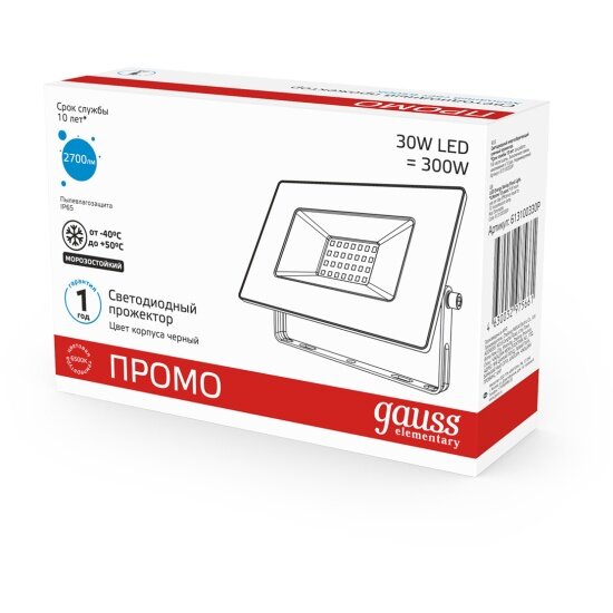 GAUSS Прожекторы светодиодные 613100330P Прожектор светодиодный ДО-30 Вт 2700 Лм 6500К IP65 200-240 В PROMO черный LED Elementary