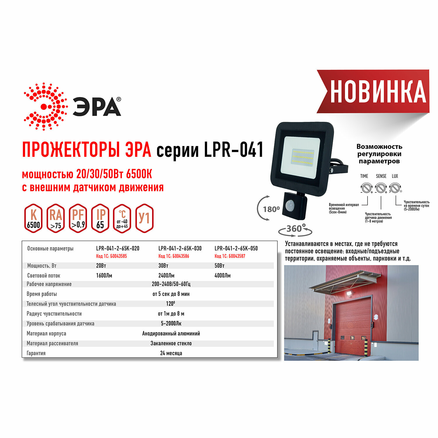 Прожектор уличный Эра LPR-041-2-65K-020, 20Вт, с датчиком движения [б0043585]