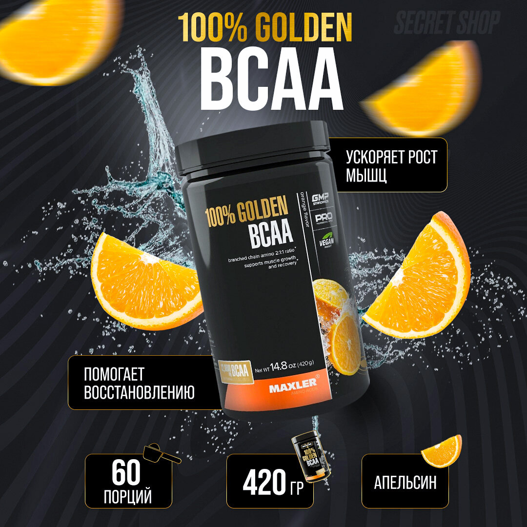 Аминокислоты Maxler 100% Golden BCAA - Апельсин, 420г - БЦАА в соотношении 2:1:1 - В форме порошка - 60 порций