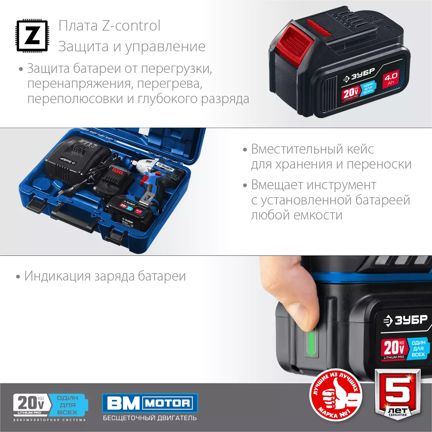ЗУБР 20В, 2 АКБ, в кейсе, бесщеточный, аккумуляторный гайковерт GB-250-42 Профессионал