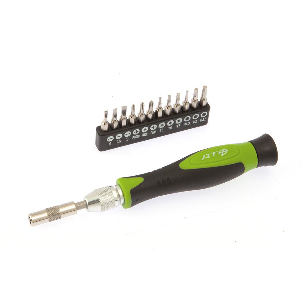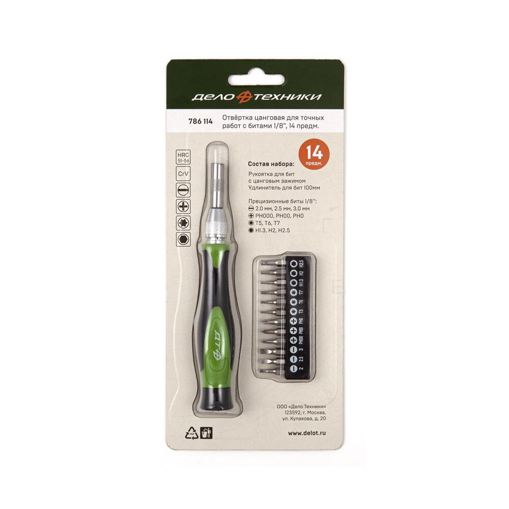 Отвертка ручная Дело техники, цанговая, для точных работ, с битами 1/8'', 786114, зеленый, серебристый, черный, 14 предметов