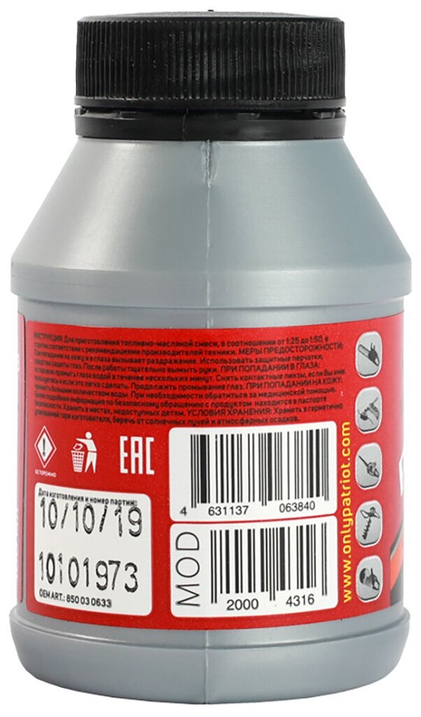 Моторное масло минеральное PATRIOT POWER ACTIVE 2T/ 100 мл/ для двухтактных двигателей/ бензопил/ триммеров