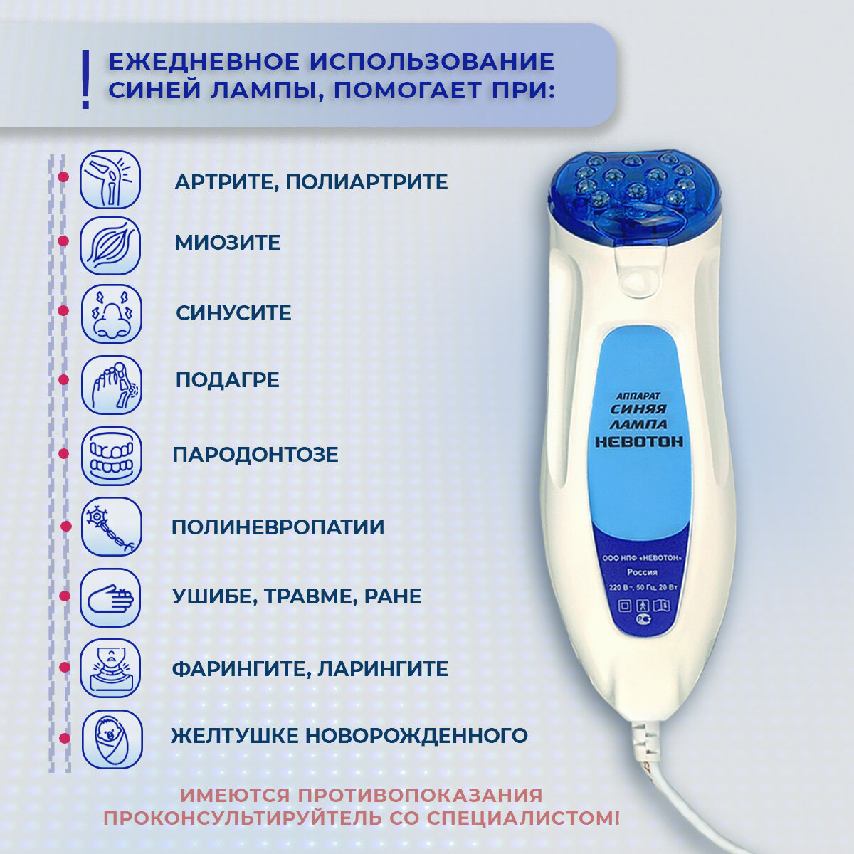 Аппарат фототерапевтический светодиодный Синяя лампа, Невотон, для лечения артрита, ушибов, травм, подагры, пародонтита