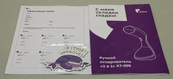 Отпаривает достаточно шустро (я не фанат идеальных стрелочек, мне надо просто периодически убирать замятости и складки), что не отпарил - можно прогладить. Объёма мне вполне хватает на 4-5 футболок-рубашек-юбок в состоянии "снято с сушилки". Наливать воду - не проблема, если есть кувшинчик с носиком или любая подобная ёмкость. Вот сливать воду действительно сложно, но есть лайфхак: слив, сколько можно, открываешь обе пробки и остатки воды банально вытрясаешь :) В комплекте идут две дополнительные насадки: тканевая для деликатных тканей (чтобы не касаться ткани "утюжком") и щёточка для очистки. Тканевую не пробовала ещё, а вот щётка с кошачьей шерстью справляется "на ура". А ещё в заказ положили магнитик с китом-маскотом фирмы и флаеры со всякими акциями (подарки за отзывы/посты в соцсетях). Мелочь, а приятно :) |