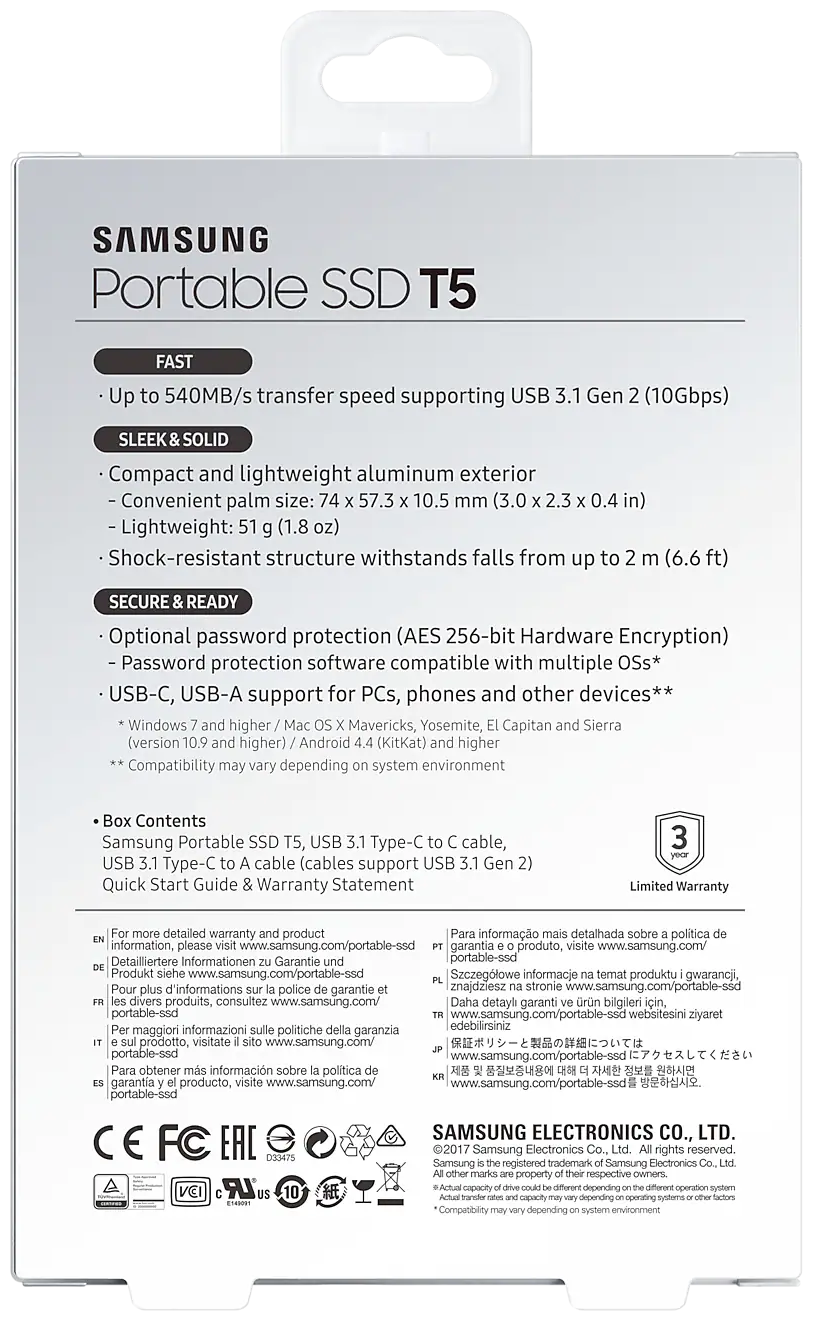 2 ТБ Внешний портативный твердотельный SSD накопитель Samsung T5 (MU-PA2T0B/WW) USB 3.1, черный