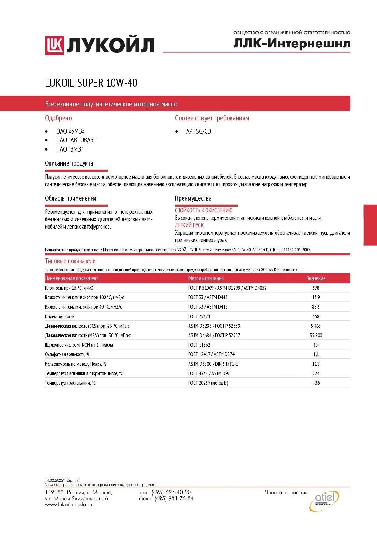 Масло моторное полусинтетическое ЛУКОЙЛ супер 10W 40, API SG CD, 5 л LUKOIL QBFQH8 1436797453 YVW 81A 19193 LUKOIL 19193