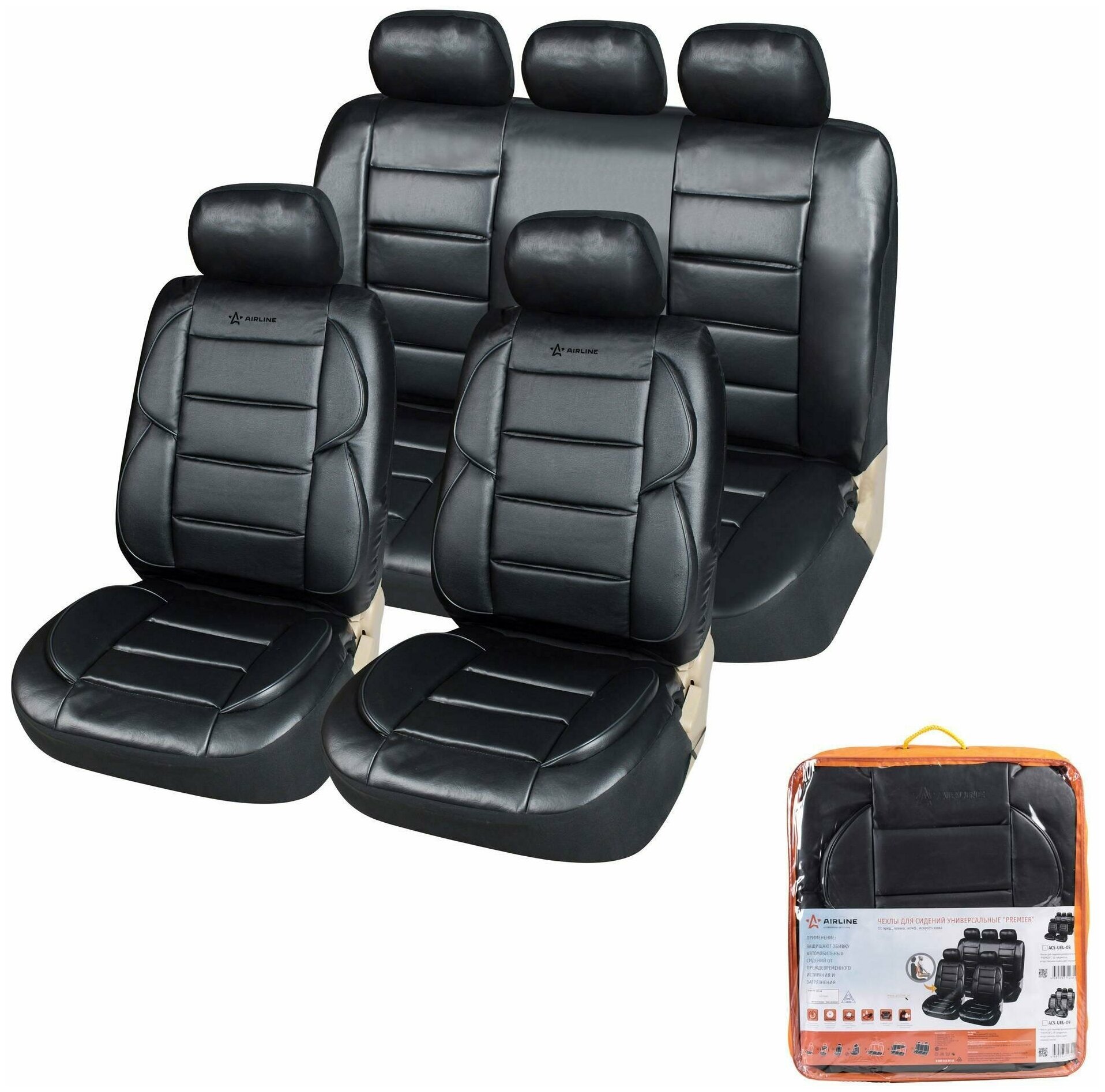 AIRLINE ACS-UEL-08 Чехлы на сиденья универс. PREMIER, 11пред., повыш.комф., искус.кожа, цвет черн. (ACS-UEL-08)