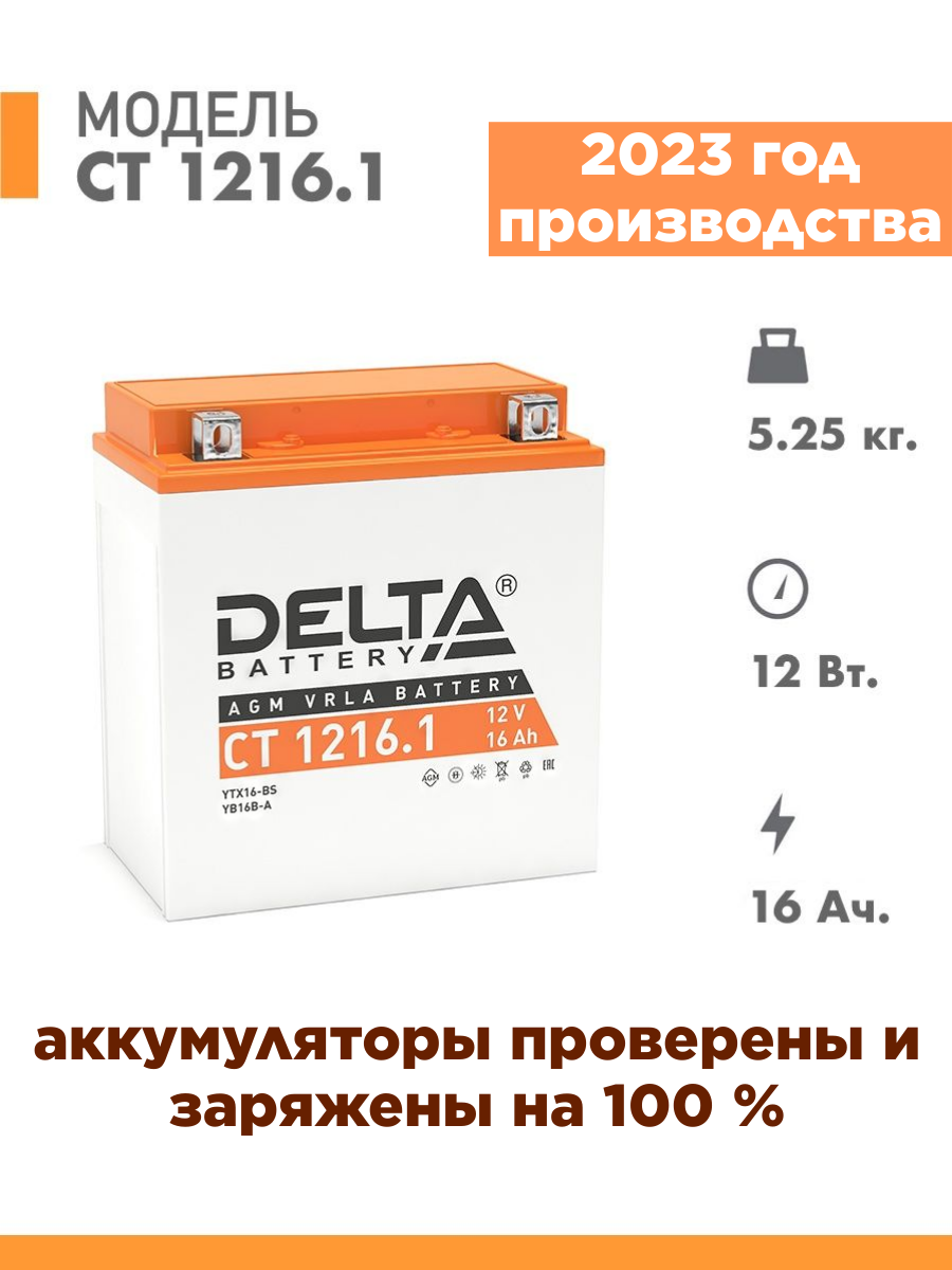 Мото аккумулятор стартерный Delta CT 1216.1 12В 16Ач прямая полярность 230А (12V 16Ah) (YTX16-BS; YB16B-A) AGM, аккумулятор для мотоцикла, мопеда, квадроцикла, снегохода, гидроцикла генератора