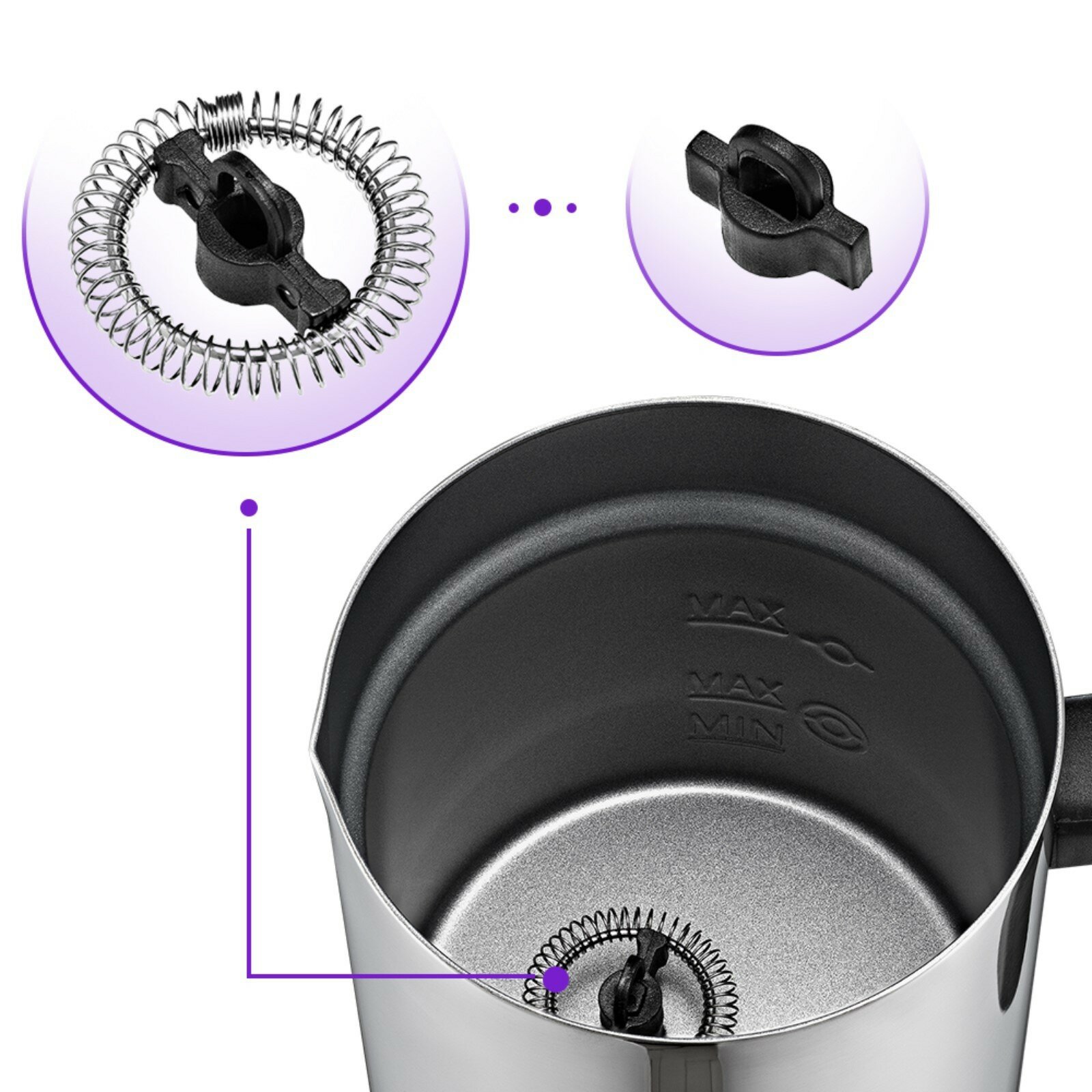 - пенка холодного молока - пенка на молоке с подогревом - легкая, воздушная пенка Приготовление горячего шоколада разогрев до 70 градусов два вида венчиков - один установлен для изготовления пенки - второй крепится на внутренней стороне крышки для смешивания Очень тихий и шустрый Качество прекрасное. Внутренне покрытие анти-пригарное, крышка крепится плотно и герметично. отключается автоматически примерно через 3 - 4 минуты |