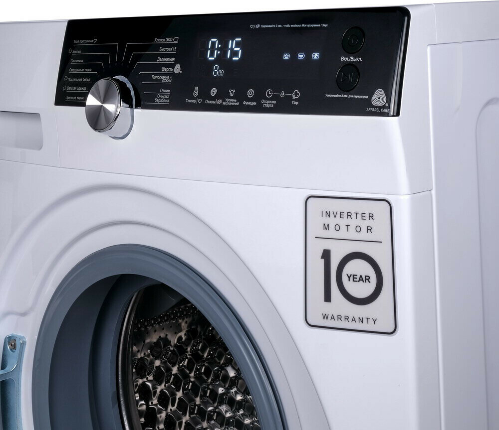 | Плюсы: | Внешний вид, тихая работа, инверторный двигатель, много режимов стирки, большая загрузка белья. |