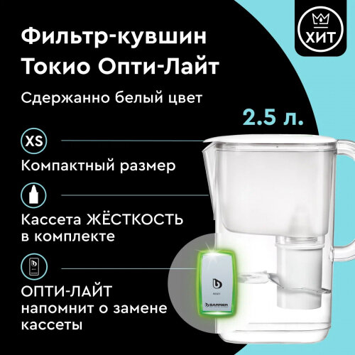 Фильтр-кувшин для очистки воды барьер Токио XS c электронным индикатором замены кассеты Опти-Лайт, 2,5 л, цвет белый