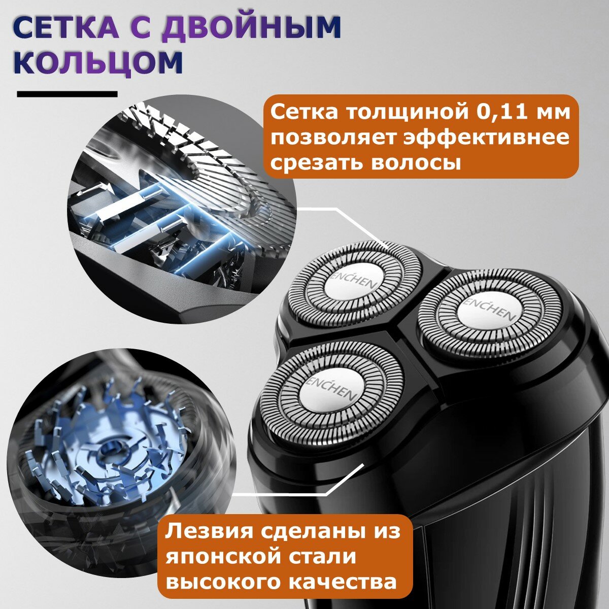 Электробритва Enchen Blackstone 3, роторная, 3 плавающие головки, Li-ion аккумулятор, IPX7 + дополнительная насадка