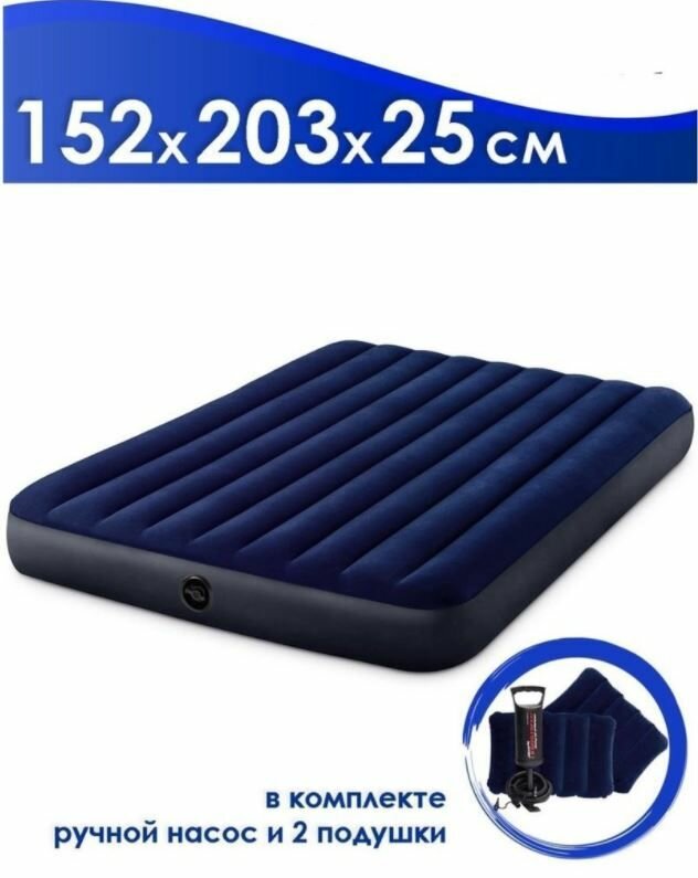 Матрас надувной INTEX с ручным насосом и 2 подушками в комплекте, 183 х 203х 25 см