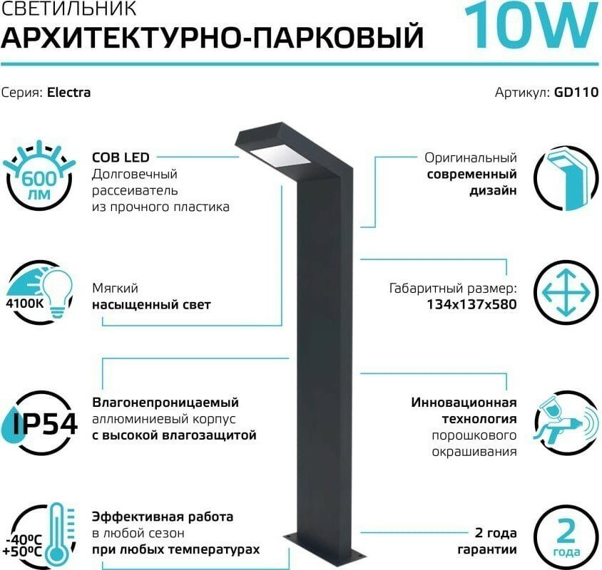 Ландшафтный светильник Gauss LED Electra 10W, 600Lm, 4000K, 134x137x580mm, 170-240V / 50Hz, IP54,1/4 интересное:
