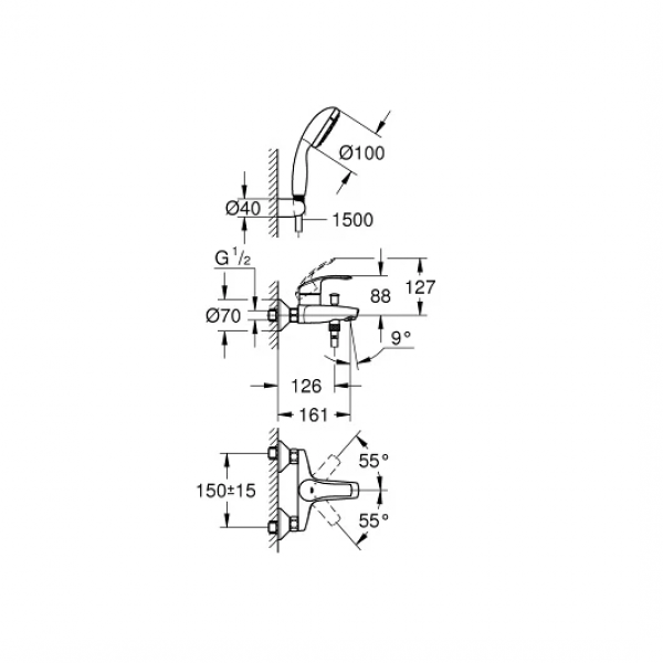 Смеситель для ванны Grohe Eurosmart, настенный монтаж, ручной душ, держатель, шланг, хром 3330220A