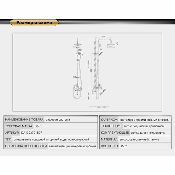 | Дополнительная информация | высота стойки для душа: 1215 мм; диаметр душевой лейки: 76 мм; диаметр верхнего душа: 200 мм |