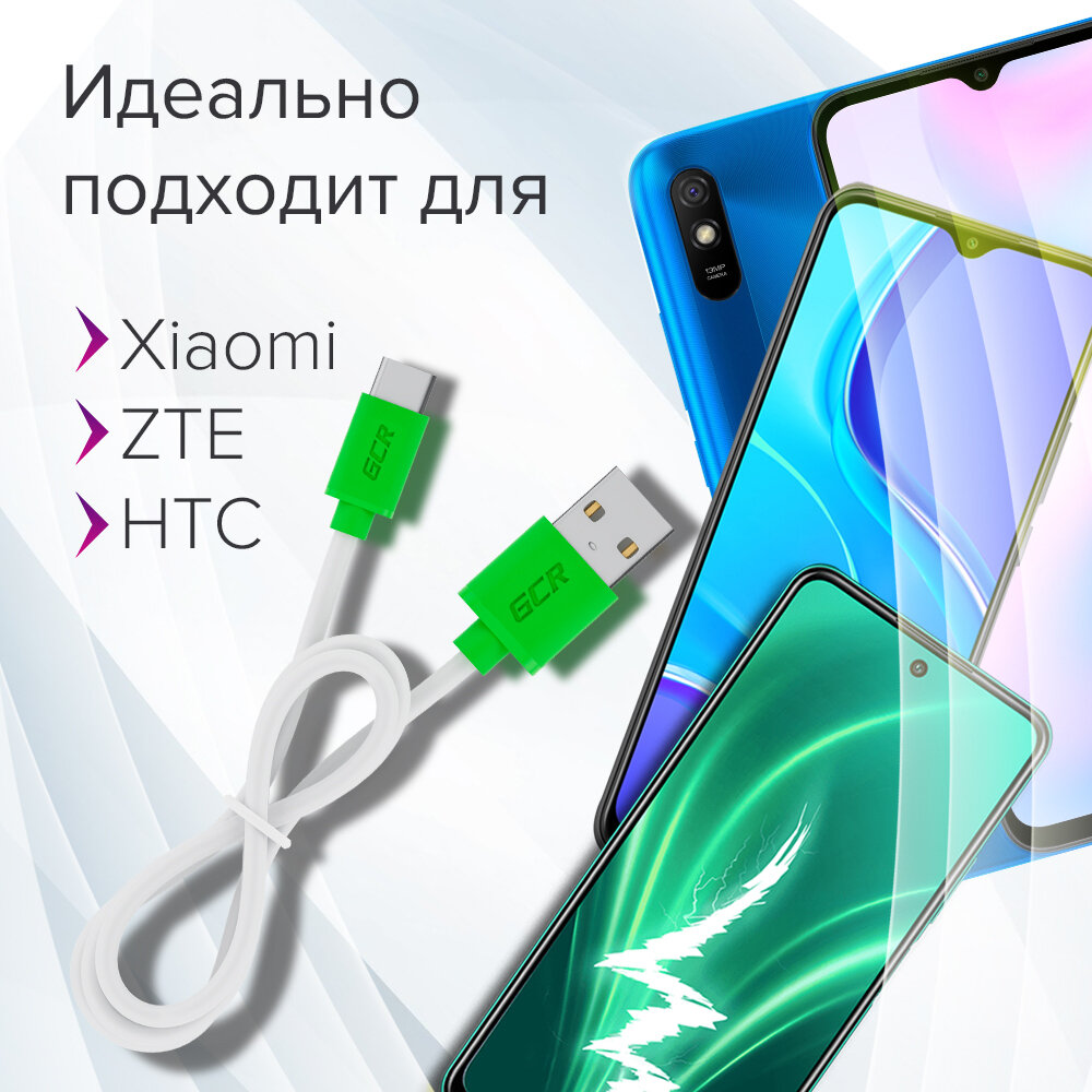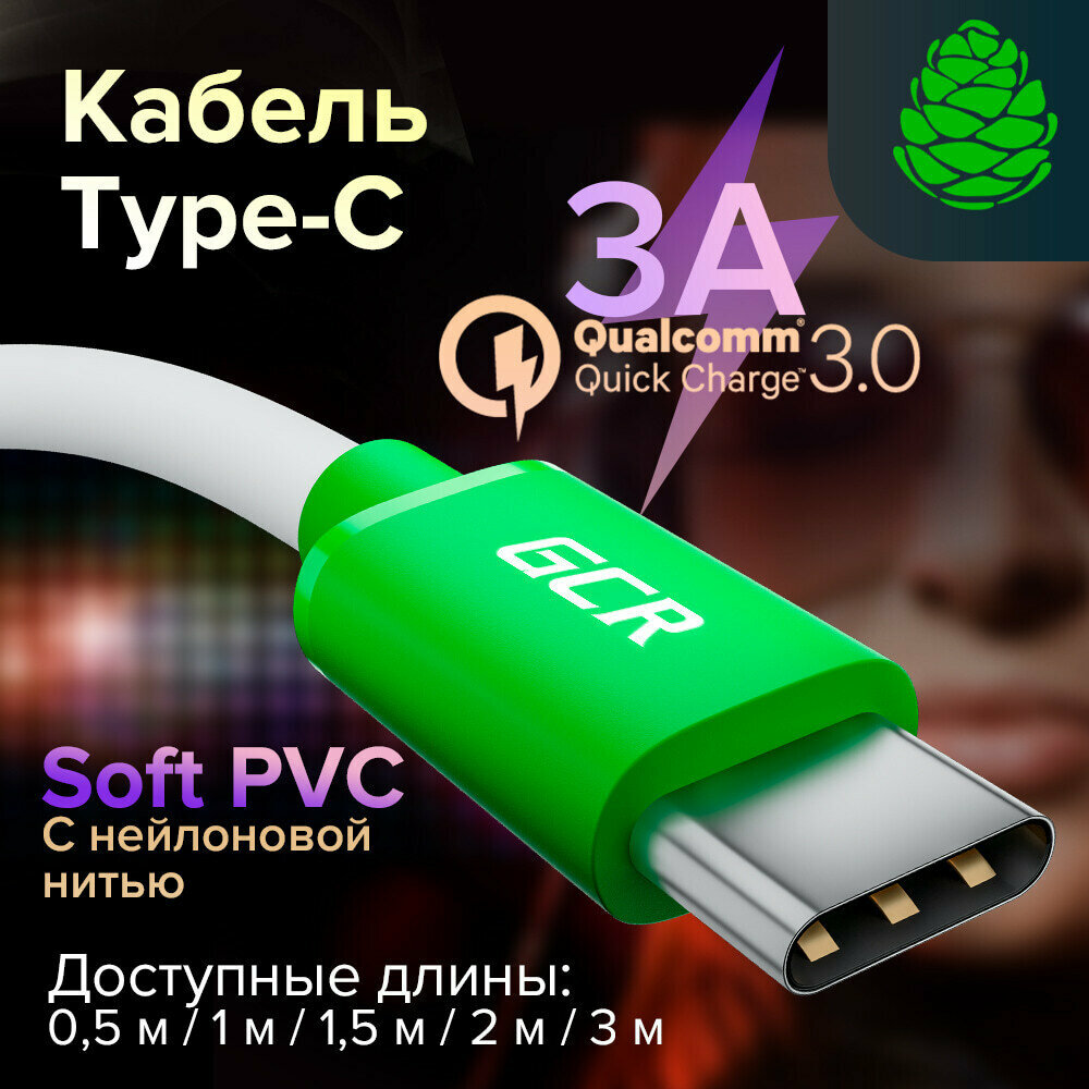 GCR QC Кабель 1.0m, TypeC, быстрая зарядка, белый TPE, зеленые коннекторы, 28/22 AWG