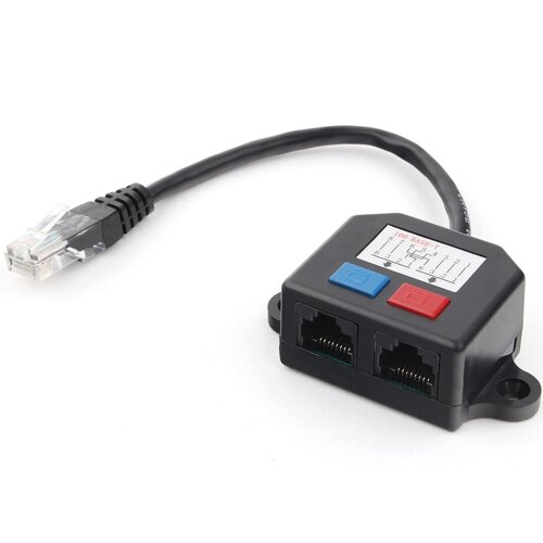 Данное устройство делит и объединяет RJ45, для проведения сигнала с двух RJ45 портов в 2 RJ-45 порта по одному кабелю. Оно НЕ РАЗВЕТВЛЯЕТ один RJ45 выход сетевого оборудования в 2 и подобных разветвителей не существует в природе, покупайте для этой цели маршрутизатор или коммутатор. С обжимными клещами тоже самое можно сделать и бесплатно =) , зато так - красивше. |