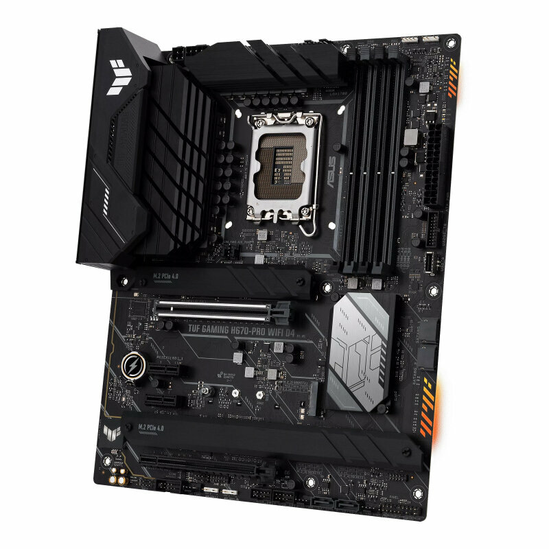 Материнская плата ASUS TUF GAMING H670-PRO WIFI D4 Socket 1700, Intel H670, 4xDDR4, PCI-E 5.0, 2500 Мбит/с, Wi-Fi, Bluetooth, 4xUSB 3.2 Gen1, 2xUSB 3.2 Gen2, USB 3.2 Gen2x2 Type-C, HDMI, DisplayPort, подсветка, ATX
