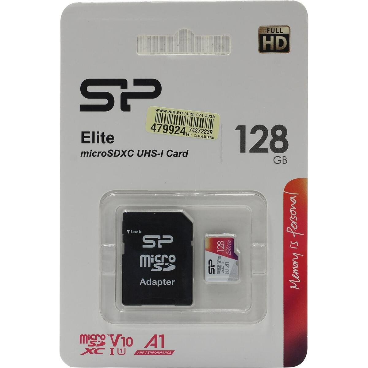 Карта памяти microSDXC UHS-I U1 Silicon Power Elite 128 ГБ, 100 МБ/с, Class 10, SP128GBSTXBV1V20SP, 1 шт., переходник SD