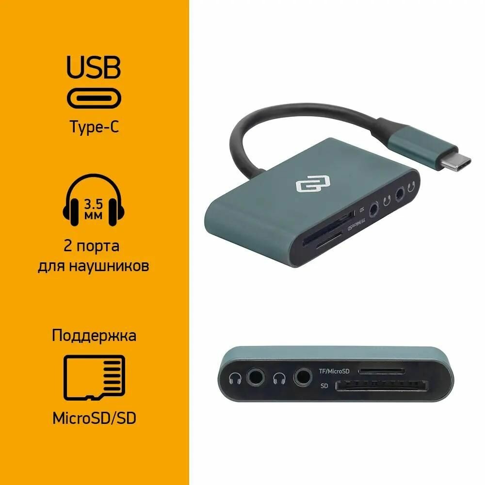 Кард-ридер OTG Digma CR-СA2512-G, Type C/Micro SD/ SD/ 2х3.5мм, серый