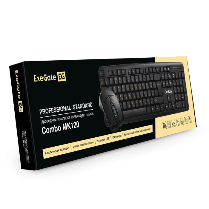 Комплект ExeGate Professional Standard Combo MK120 (клавиатура влагозащищенная 104кл. + мышь оптическая 1000dpi, 3 кнопки и колесо прокрутки, длина кабелей 1,5м; USB, черный, Color Box)