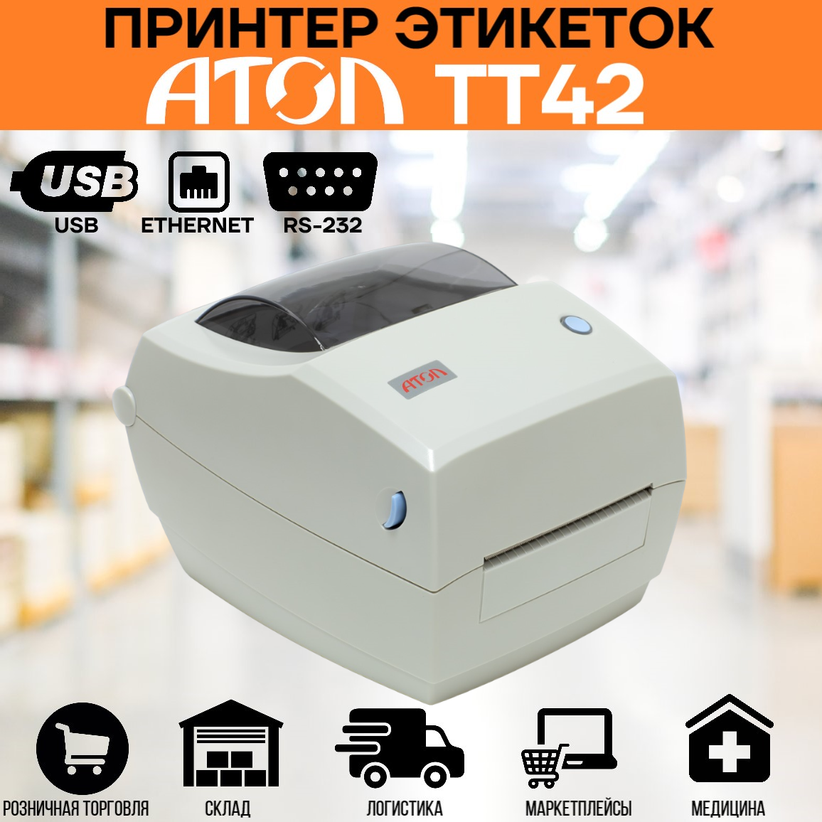 Принтер этикеток Атол ТТ42 (203dpi, термотрансферная печать, USB, RS-232, Ethernet 10/100, ширина печати 108 мм, скорость 127 мм/с)