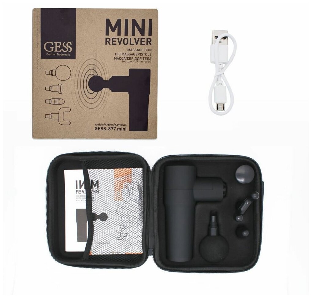 Беспроводной перкуссионный массажер для тела GESS Mini Revolver, массажный пистолет, 4 насадки интересное: