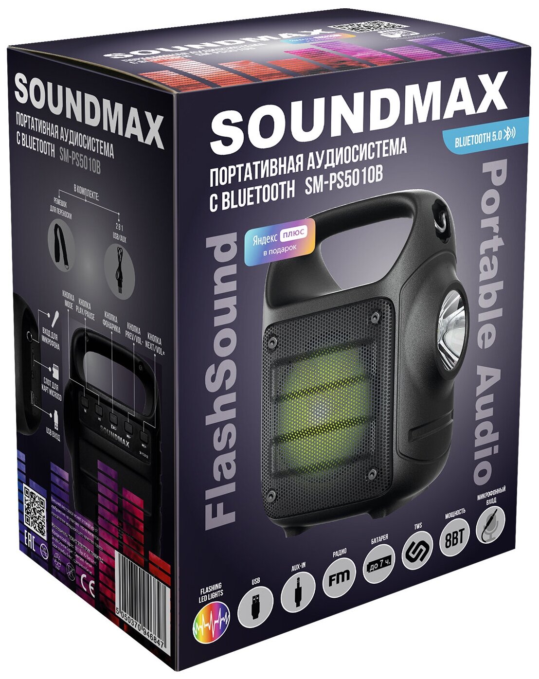 Портативная колонка SM-PS5010B, 8Вт, 1200мАч, FM, BT 5.0, microSD, подсветка,фонарь