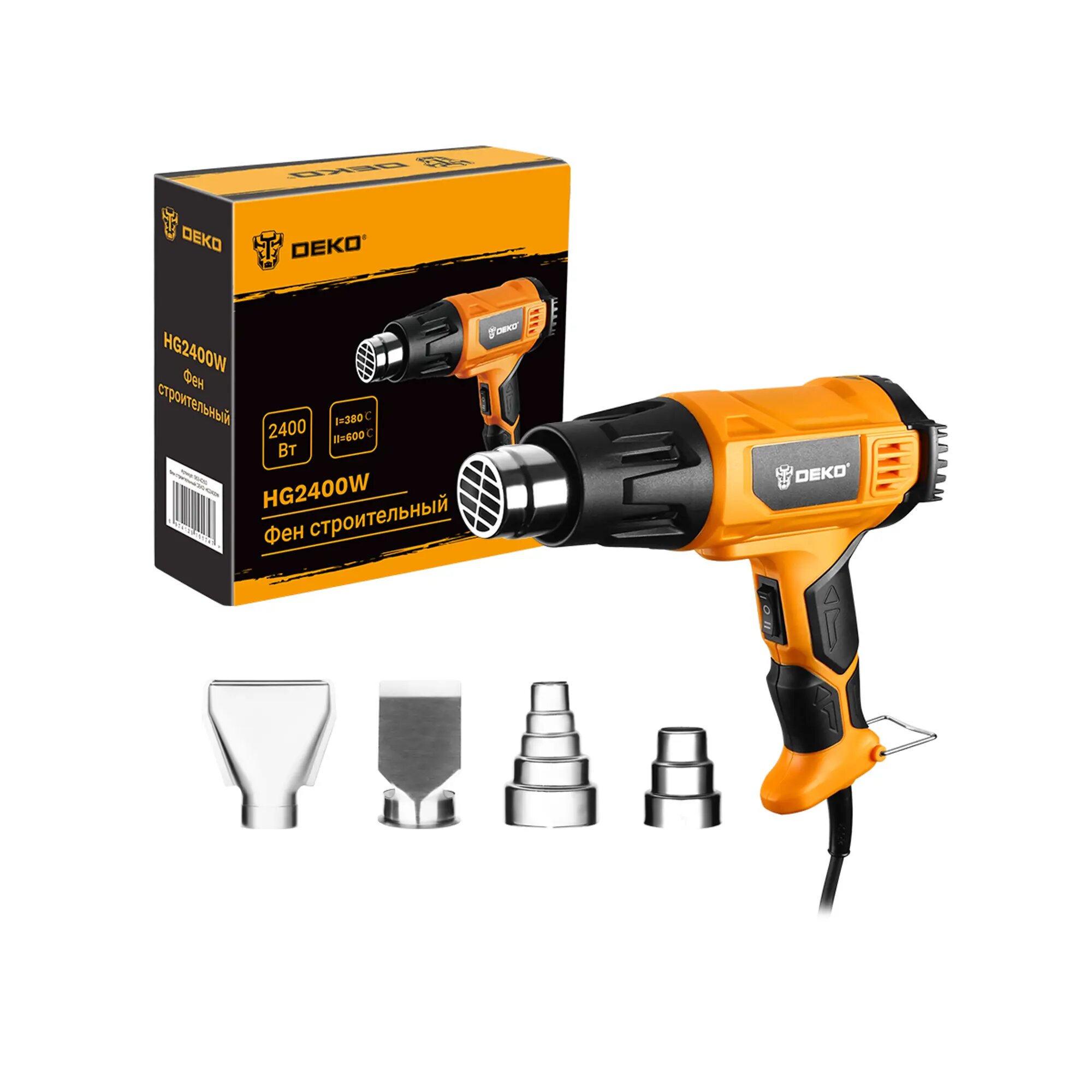Фен технический DEKO HG2400W, 2400 Вт, 300/500 л/мин, 380/600 °С, 4 насадки 7532462
