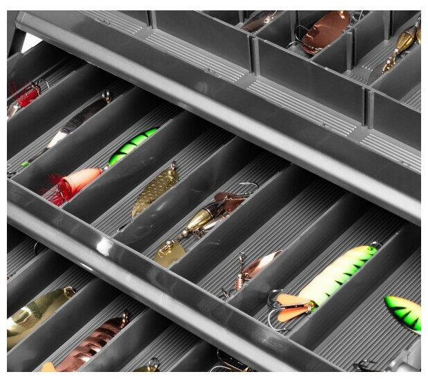 Этот ящик - яркий пример, как нужно подходить к задумке и реализации какого-то продукта. Спроектирован ящик великолепно: 1. При закрытии крышки, три выдвигающиеся полки НЕ ЗАНИМАЮТ МЕСТО в нижнем объеме ящика, а остаются в объеме крышки! Тем самым можно спокойно внизу размещать довольно габаритные вещи: катушки, бобины с плетенкой/леской и т.п. 2. Множество отсеков, на некоторых из них сменные перегородки, которыми можно менять размер отсека, в зависимости от потребностей. 3. Сверху на крышке - отсек с прозрачной крышкой под мелочи, которые должны быть всегда под рукой. 4. По бокам - проушины, за которые можно закрепить ремень, чтобы носить на плече. 5. Спереди на крышке отверстия. Предполагаю, что сделано для того, чтобы можно было повесить замочек. Ну, или просто чем-то закрепить для страховки (чтобы крышка случайно не открылась). 6. Размер ящика - оптимален (для меня). Он не маленький, чтобы потом пришлось еще что-то в пакетах таскать, все влезло. Но и не громоздкий, чтобы мучиться с габаритами и весом. Изготовлен ящик безупречно: 1. Качество пластика - отличное, брать в руки приятно. Правда, как будет на морозе не знаю, но мне не актуально, я брал для открытой воды. 2. Литье - качественное, нет ни заусенцев ни следов какой-то обработки. 3. Ручка - крепкая, надежная. 4. Застежки - в меру тугие, фиксируются четко. И все это - по цене одного похода за продуктами. Почти уверен, что ящик задумывал и воплощал в реальности заядлый рыболов. Потому что кто-то другой с таким вниманием подойти к этому процессу навряд ли бы смог... Но даже если я и ошибаюсь, ничего страшного, т.к. в любом случае хочется сказать этому человеку и коллективу производителя: СПАСИБО, вы просто молодцы! Вдвойне приятно еще и то, что ТАКОЙ ящик сделан в России, в Барнауле. Если бы все, что делается у нас делалось так, то нас бы окружали вещи качественнее и красивее. |
