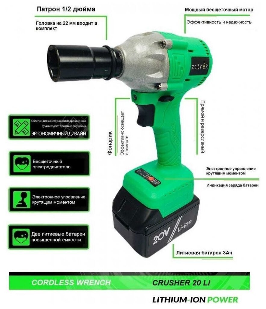 Гайковерт аккумуляторный ударный Zitrek Crusher 20-Li 20В, Li-ion аккумулятор 1шт, ЗУ, кейс . интересное: