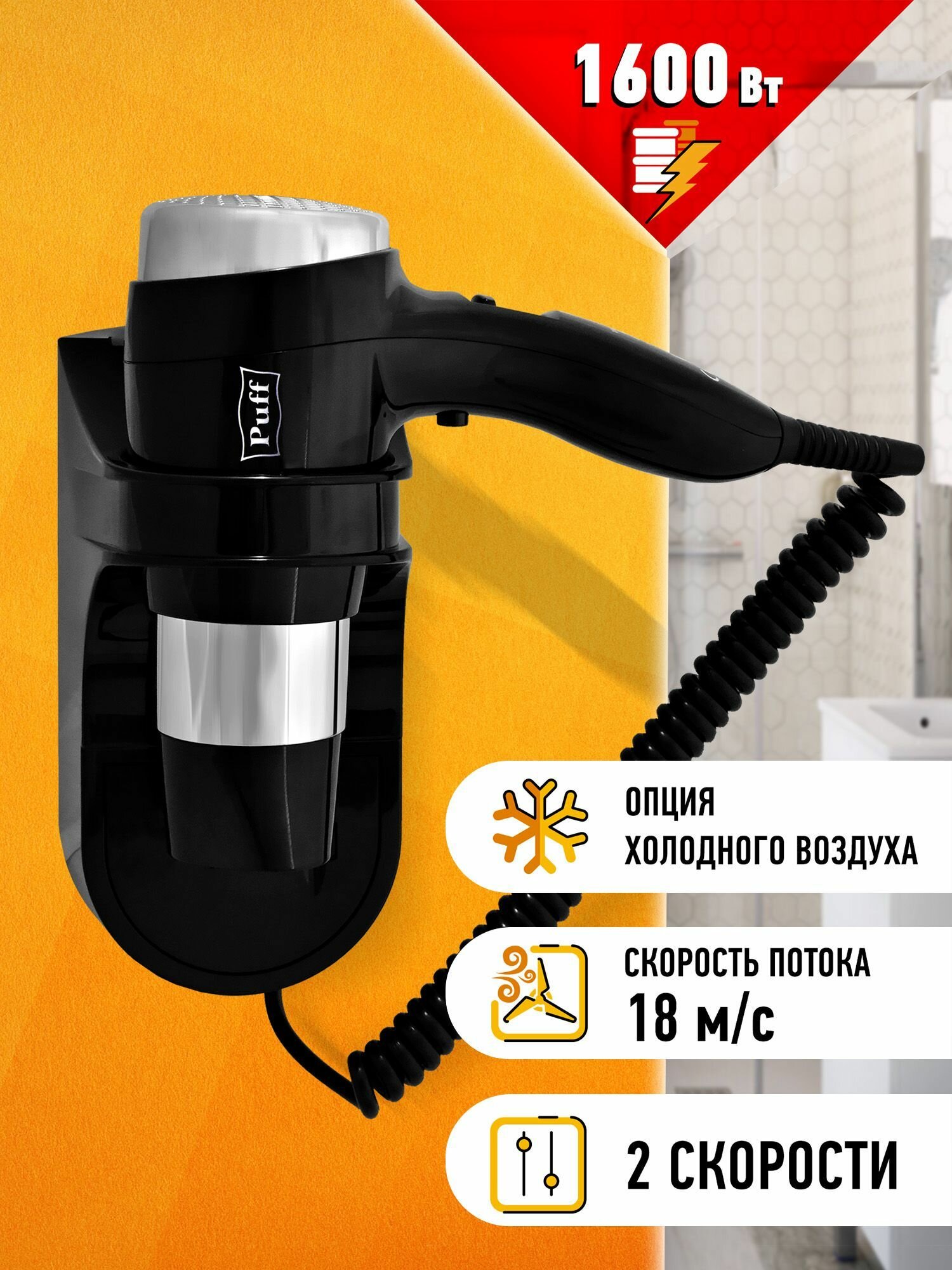 Фен PUFF 1600Вl, настенный, 1600Вт, черный