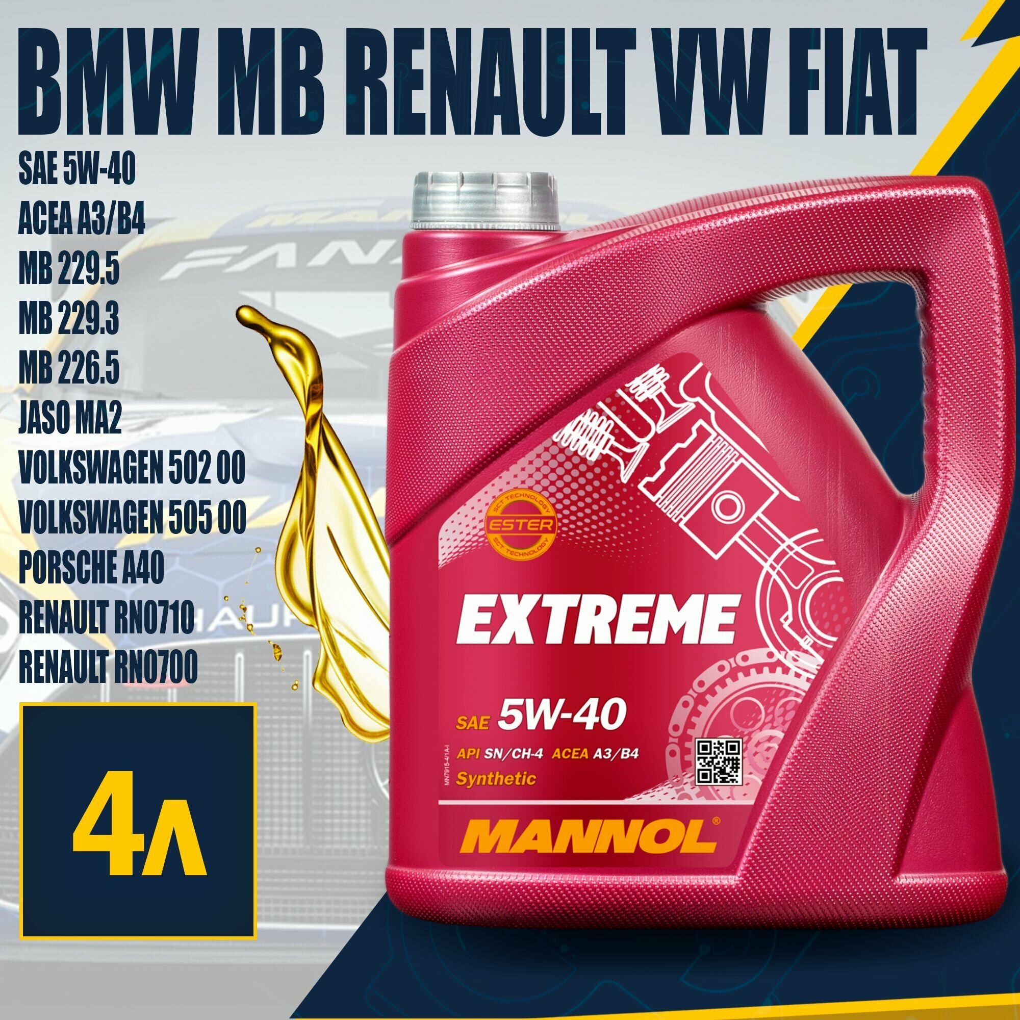 Масло Mannol Extreme 5W40 синт. 7915 (4 л) API SN/CF, VW 502.00/505.00; MB 229.3/226.5; Opel GM LL-A-025/LL-B-052