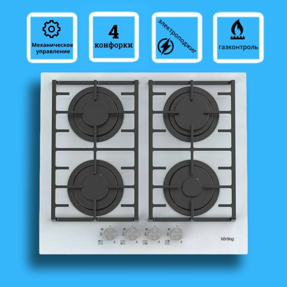 Газовая варочная панель Korting HGG 6805 CW, белая, стеклянная поверхность, 4 конфорки, газ-контроль, электроподжиг, чугунные держатели для посуды, металлические поворотные регуляторы, безопасное управление