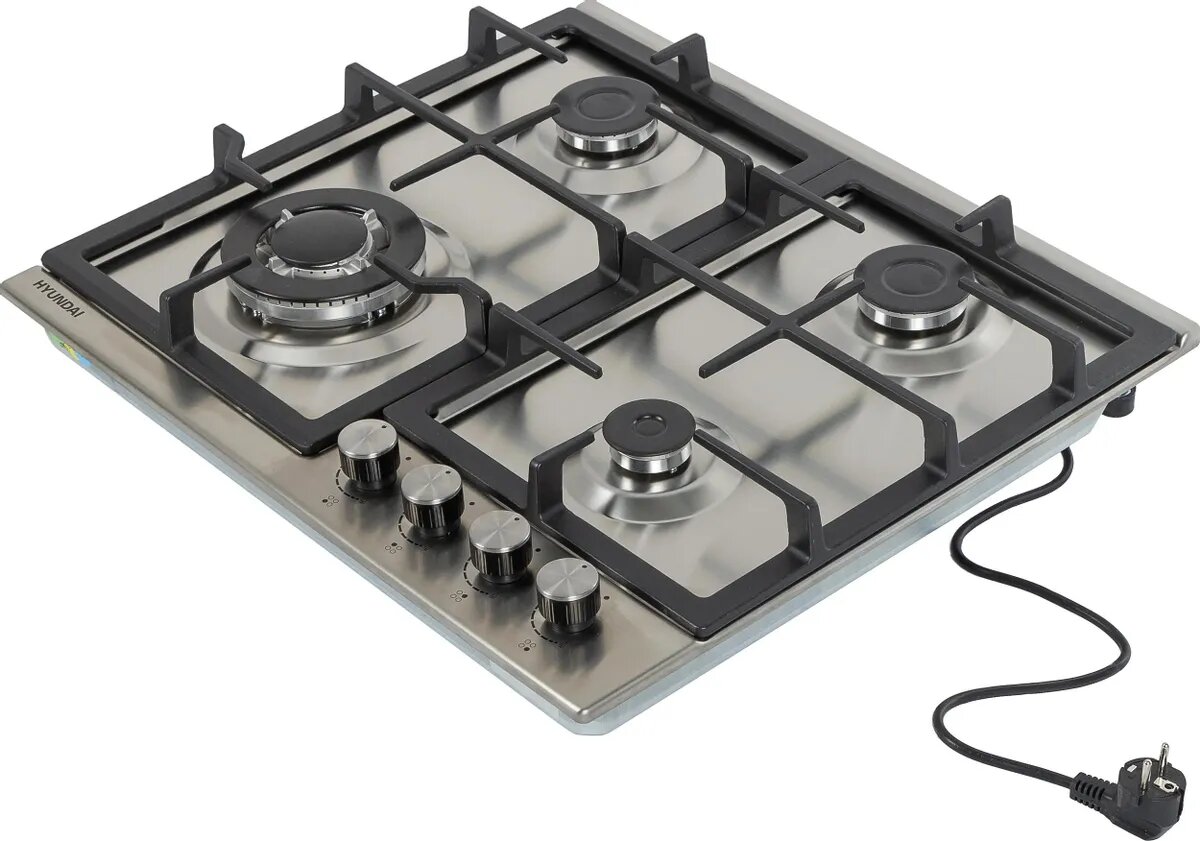 Варочная панель газовая встраиваемая Hyundai / Хендай HHG 6436 IX нержавеющая сталь 580x510x60мм 4 конфорки 2 решетки / электроподжиг / газовая плита