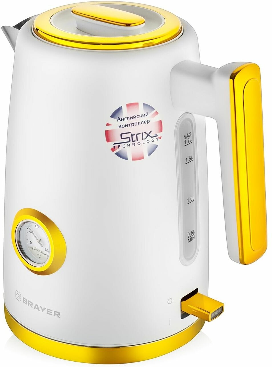 Чайник с термометром BRAYER BR1018, 1,7 л, 2200 Вт, закрытый нагревательный элемент, сталь, белый