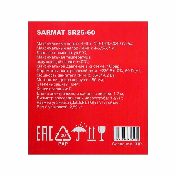 Насос циркуляционный SARMAT SR 25-60, напор 6 м, 72 л/мин, кабель 1.2 м, 35/54/82 Вт
