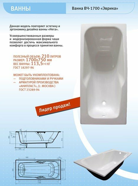 Ванна чугунная Универсал Эврика 170x75 с отверстиями под ручки интересное: