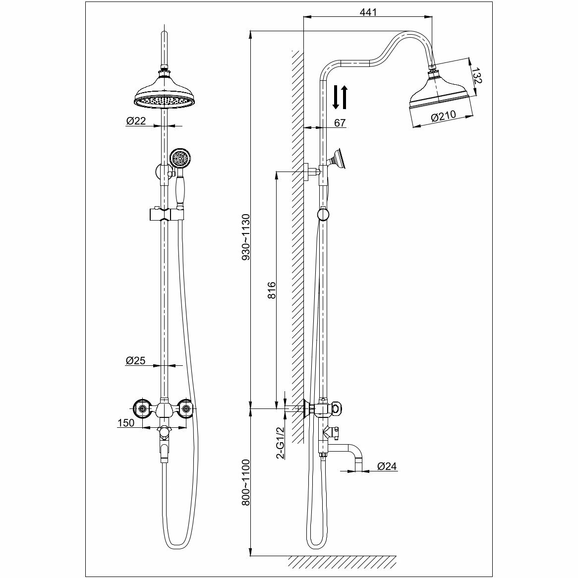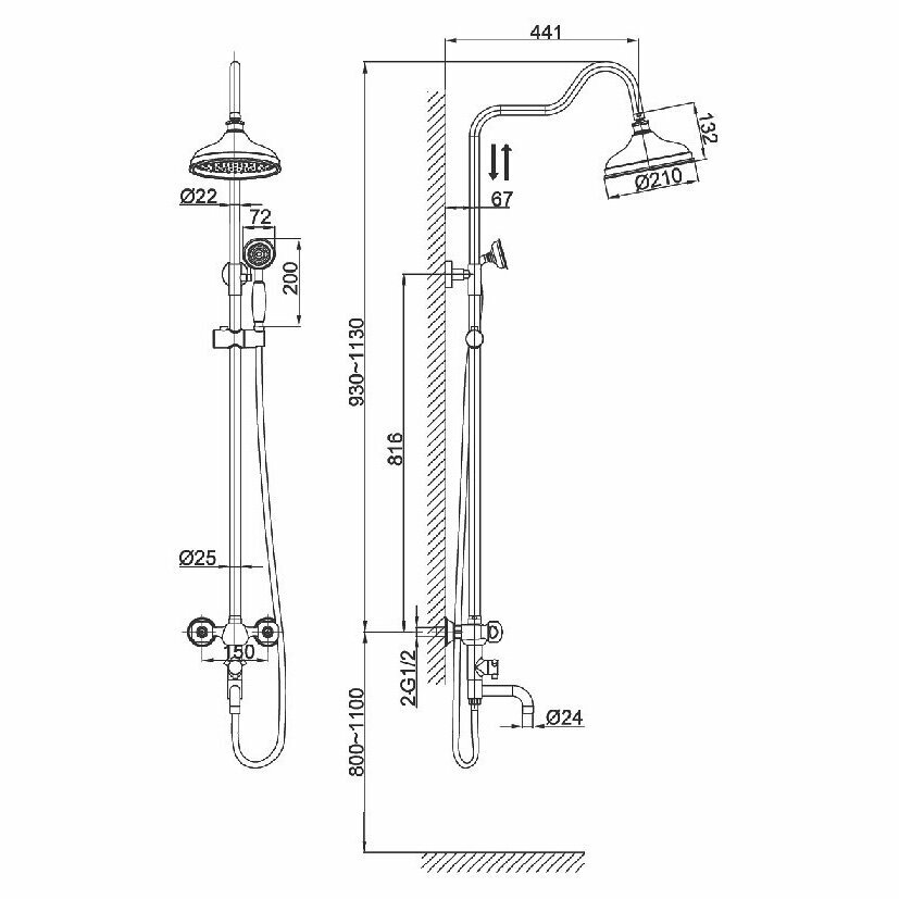 | Дополнительная информация | высота стойки для душа: 1130 мм; диаметр душевой лейки: 72 мм; диаметр верхнего душа: 210 мм |