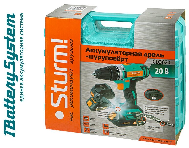 CD3620 Дрель аккумуляторная Sturm!, 20 В, 1BatterySystem, 2 акк., 2,0 Ач, кейс Sturm!