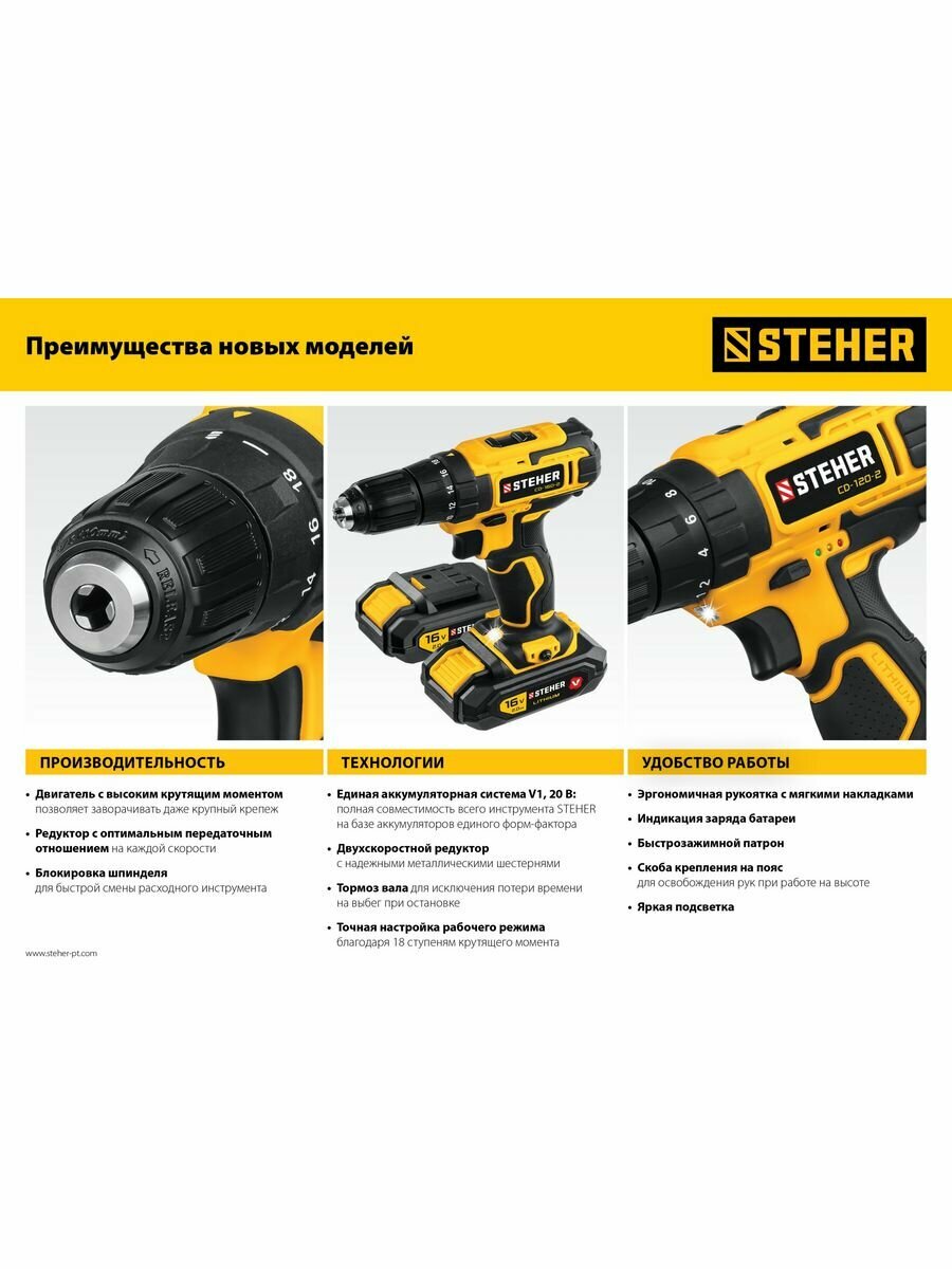СохранитьДрель-шуруповерт STEHER 20В без АКБ CD-200 интересное: