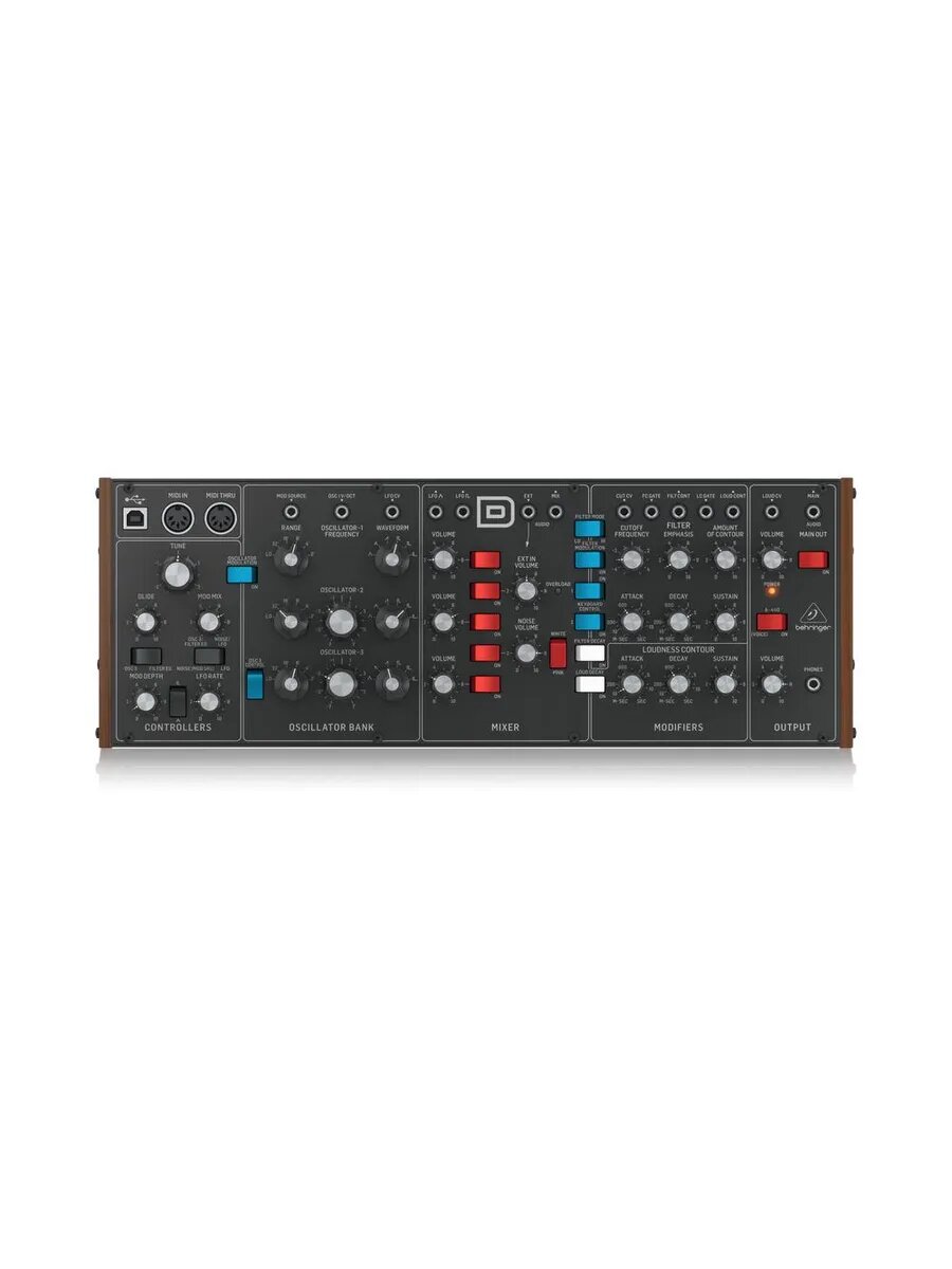 Behringer MODEL D синтезатор, полностью аналоговый, 3 VCO, генератор белого/розового шума, VCF и VCA, цепи внешнего управления, MIDI, USB