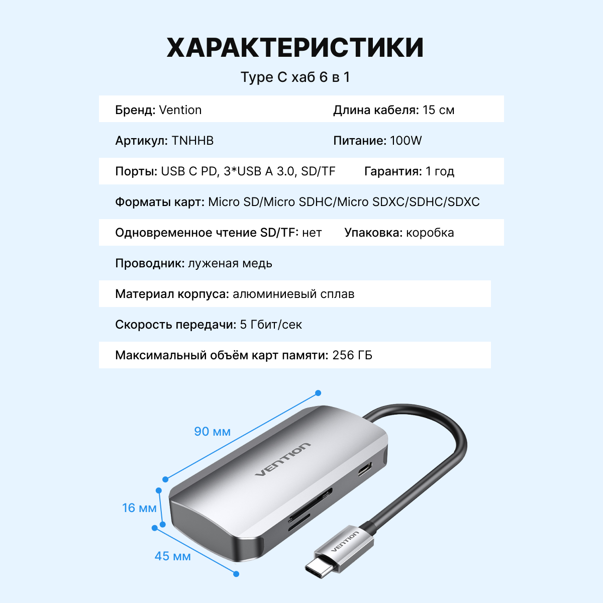 Мультифункциональный хаб Vention USB-C > USB 3.0x3/SD/TF/PD интересное: