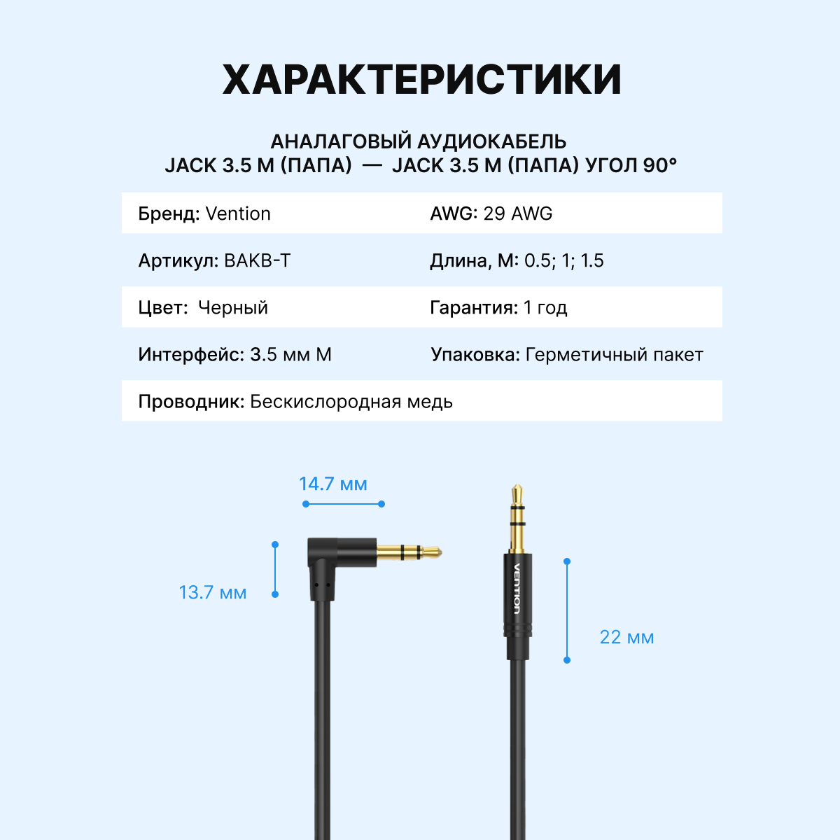 Кабель VENTION аудио Jack 3.5 mm M/Jack 3.5 mm M угол 90 - 1.5 м., чёрный